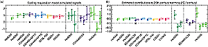 Given the uncertainties in sulphate aerosol and natural forcings and responses, these single-pattern confidence intervals give an incomplete picture. We cannot assume that the response to sulphate forcing (relative to the greenhouse signal) is as simulated in these greenhouse-plus-sulphate simulations; nor can we assume the net response to natural forcing is negligible even though observations of surface temperature changes over the past 30 to 50 years are generally consistent with both these assumptions. Hence we need also to consider uncertainty ranges based on estimating several signals simultaneously (Figure 12.12, right hand panels). These are generally larger than the single-signal estimates because we are attempting to estimate more information from the same amount of data (Tett et al., 1999; Allen and Stott, 2000; Allen et al., 2000a). Nevertheless, the conclusion of a substantial greenhouse contribution to the recent observed warming trend is unchanged.