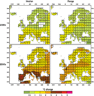 ![]() Figure 13.8: A summer (JJA) temperature change scenario for Europe for the 2020s and 2080s. Left panel is the median scaled response of five GCM experiments available on the IPCC Data Distribution Centre (http://ipcc-ddc.cru.uea.ac.uk/) and the right panel is the inter-model range (largest scaled response minus the smallest scaled response). (Source: Hulme and Carter, 2000.) |