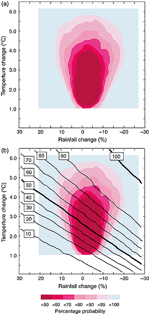 Figure 13.9: (a) Projected ranges of regional annual temperature and rainfall change for inland southern Australia in 2100 extrapolated from CSIRO (1996) with temperature sampled randomly across the projected ranges of both global and normalised regional warming and then multiplied together. Projected regional ranges for normalised seasonal rainfall change were randomly sampled, multiplied by the randomly sampled global warming as above, and then averaged. The resulting probability density surface reveals the likelihood of different climate change outcomes for this region; (b) Response surface of irrigation demand for the same region superimposed on projected climate changes as (a), showing the likelihood of exceeding an annual allocation of irrigation water supply. Risk can be calculated by summing the probabilities of all climates below a given level of annual exceedance of annual water supply; e.g., 50%, or exceedance of the annual water limit in at least one of every two years. (Source: Jones, 2000b.) |