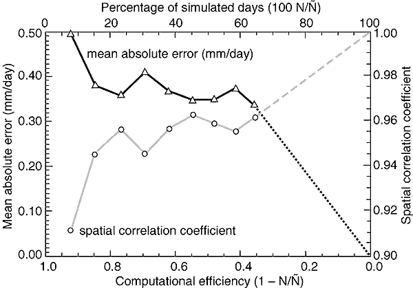 Black line: mean absolute error (mm/day), grey line: spatial correlation coefficient.