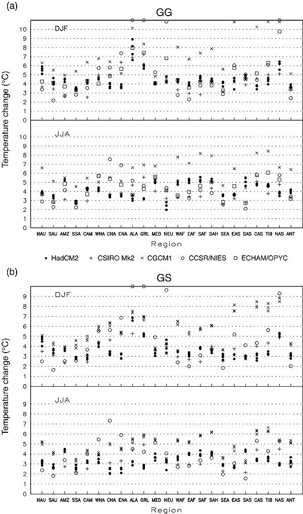 3.80°C for CGCM1 (ensemble average) and 2.64°C for CCSR/NIES (from Giorgi