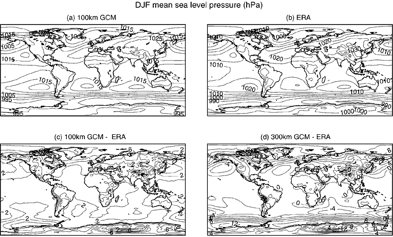 Mean sea level pressure for DJF in: (a) HadAM3a at high resolution (100 km), (b) ECMWF reanalysis (ERA), (c) HadAM3a high resolution minus ERA, (d) HadAM3a at standard resolution (300 km) minus ERA. Adapted from Stratton (1999b).