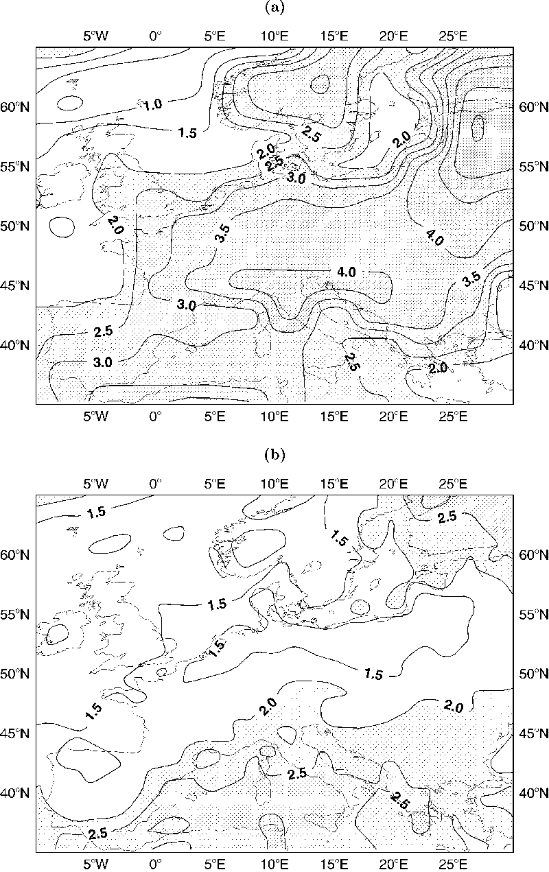 air temperature change (°C) over Europe at the time of CO2 doubling