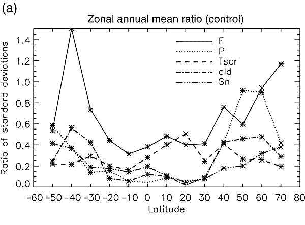 ratio for 10-degree latitude bands; (a) control simulations; (b) difference between