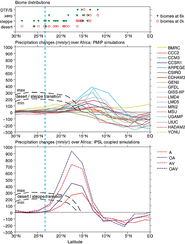 at 23°N at 6,000 yr BP (redrawn from Joussaume et al., 1999); (lower panel)