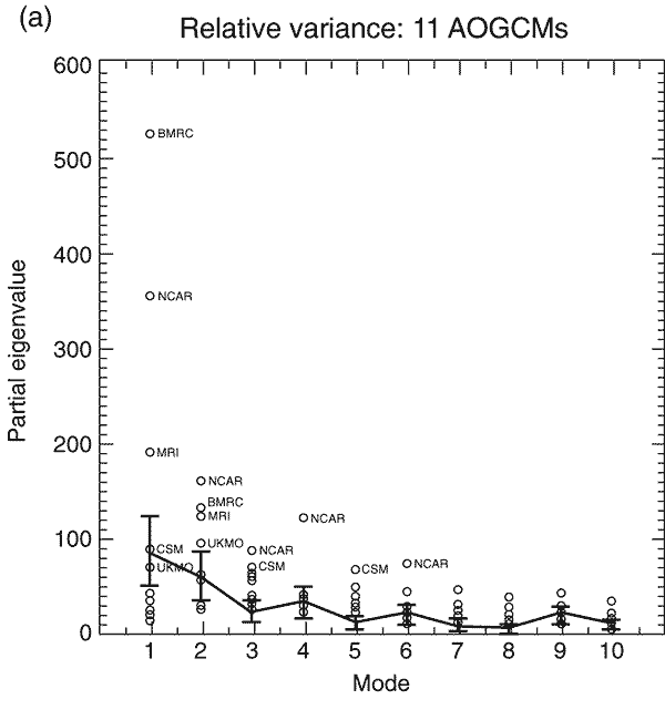 eigenvalue spectrum for the EOFs from eleven CMIP AOGCMs. The observations (heavy