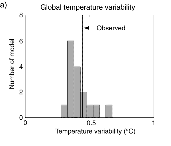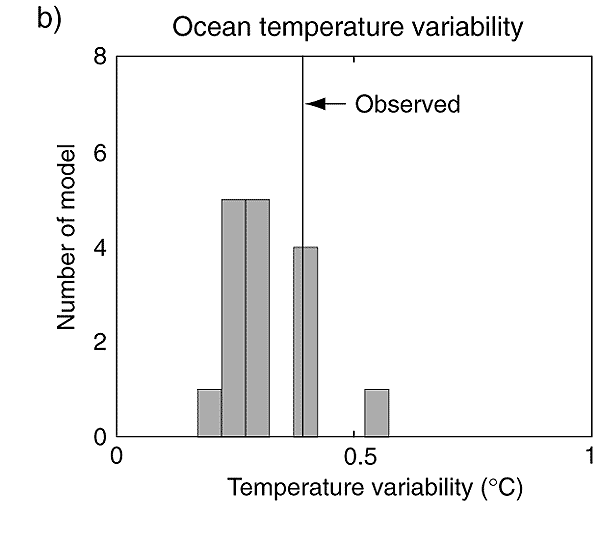amounts of variability. (b) Mean over-ocean temperature variability; three models
