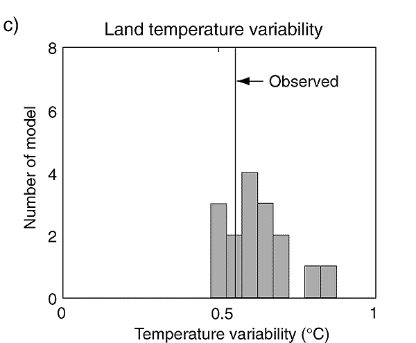 show higher than observed amounts of variability. (c) Mean over-land temperature