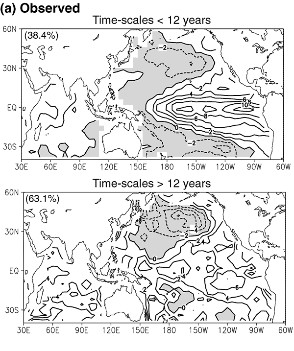 years) (upper panels) and the decadal time scale (>12 years) (lower panels)