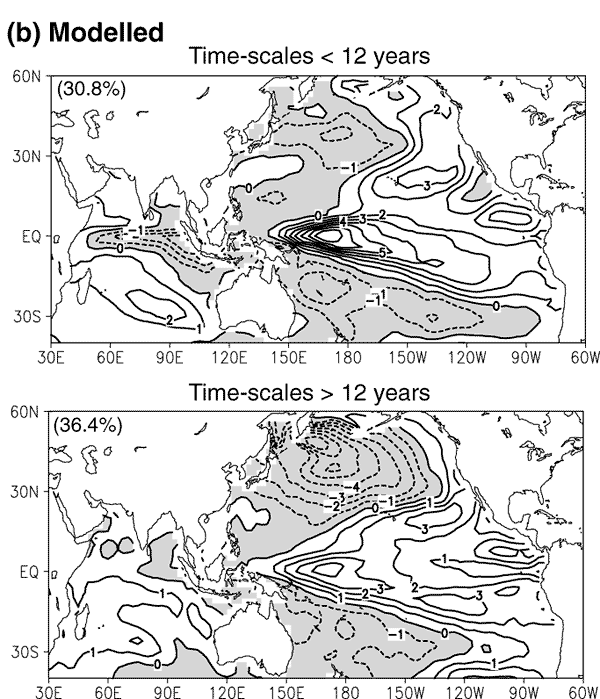 of eigenvectors for the leading EOFs of the SSTs between the ENSO time-scale (<12