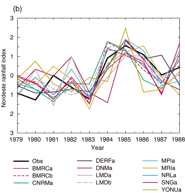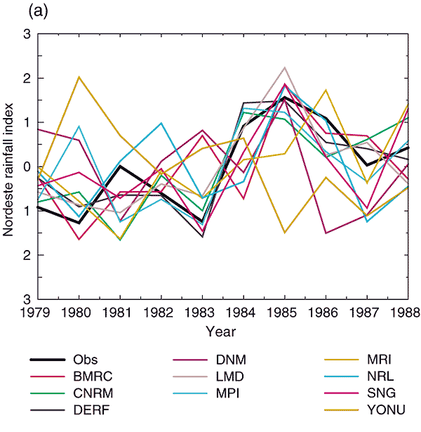 Simulated (March-May) and observed (March-April) averaged Nordeste (north-eastern Brazil) rainfall indices for (a) the original AMIP simulations, (b) the revised AMIP simulations (Sperber et al., 1999).