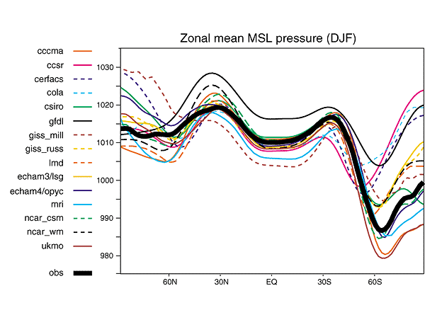 Observed values are shown on the zonal mean plot (thick solid line) and the difference