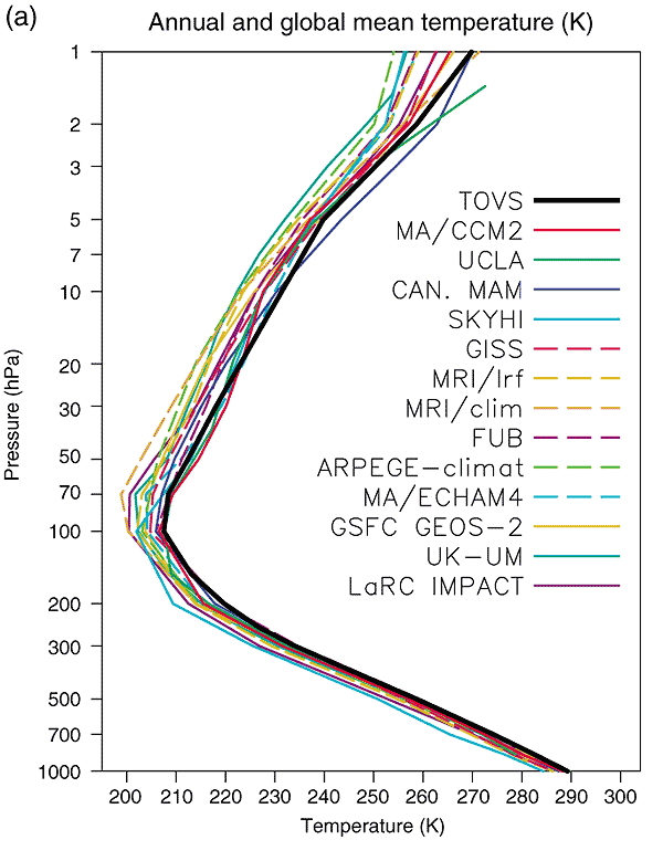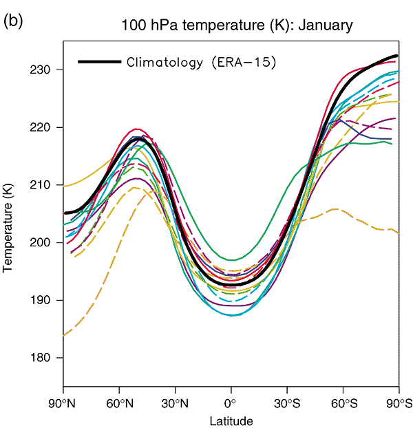 (a) Vertical structure of the annual-mean, globally averaged temperature (K) from observations and the thirteen models. (b) Latitudinal structure of January temperature at 100 hPa. From Pawson et al. (2000).
