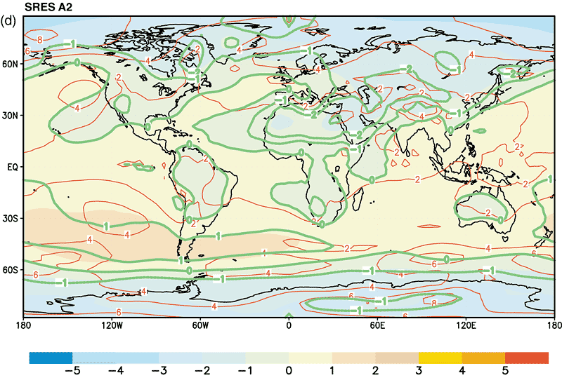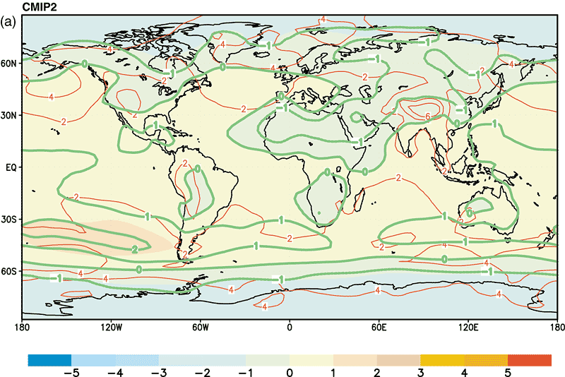 the CMIP2 scenarios at the time of CO2-doubling; (b) the IPCC-DDC scenario