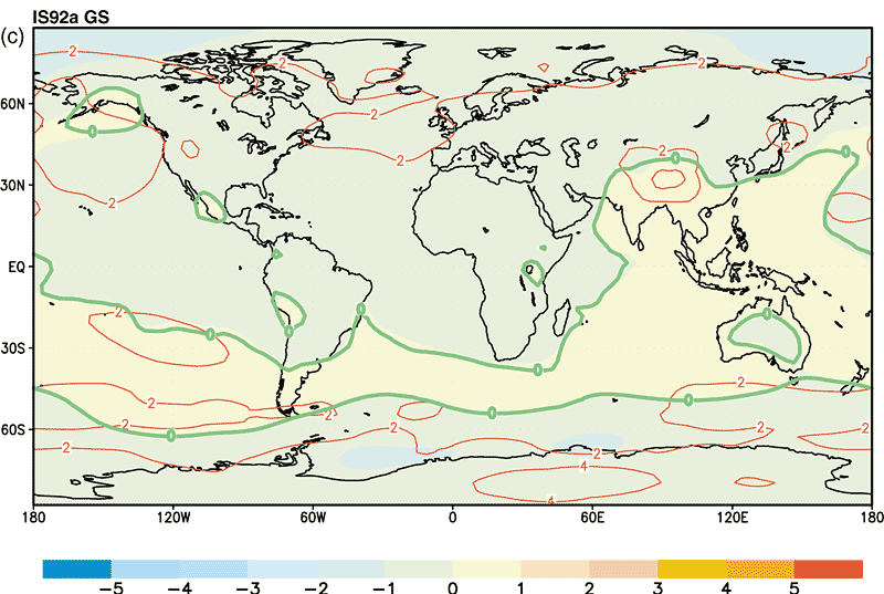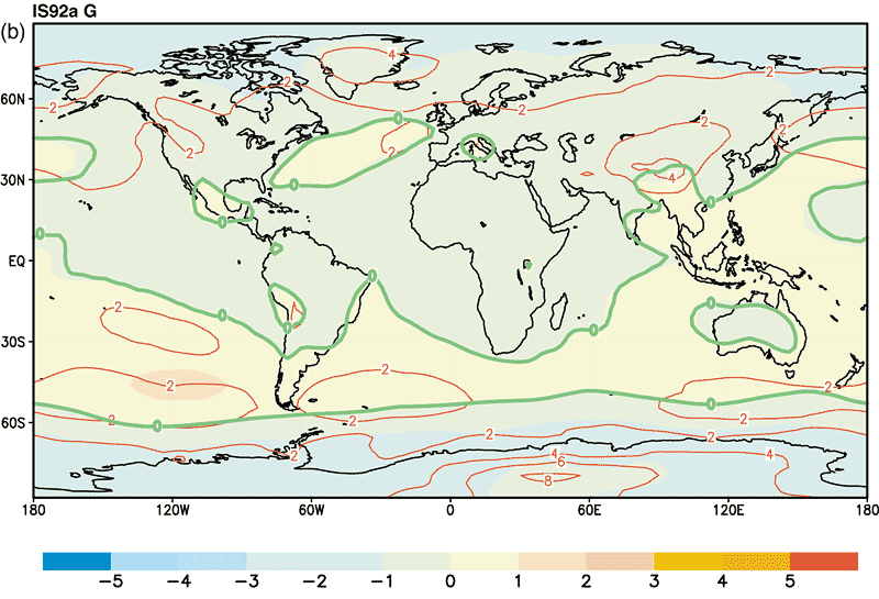 IS92a (G: greenhouse gases only) for the years 2021 to 2050 relative to the period