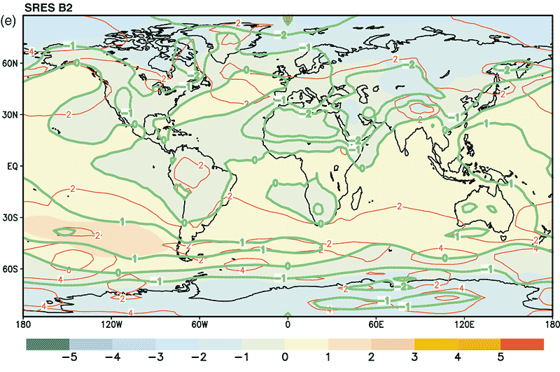 scenario B2. Both SRES-scenarios show the period 2071 to 2100 relative to the