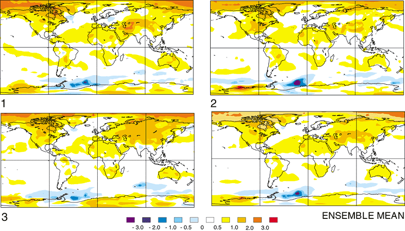initial conditions a century earlier. The ensemble mean is the average of the