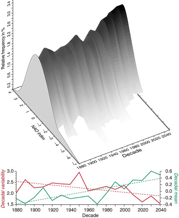PDF (greyscale bars) consists of 160 NAO index realisations including the monthly