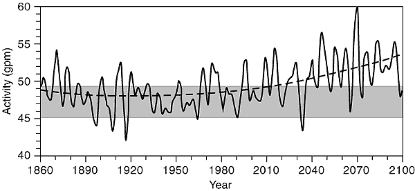 dashed line; y-axis is activity in gpm (geopotential metres) and x-axis is time
