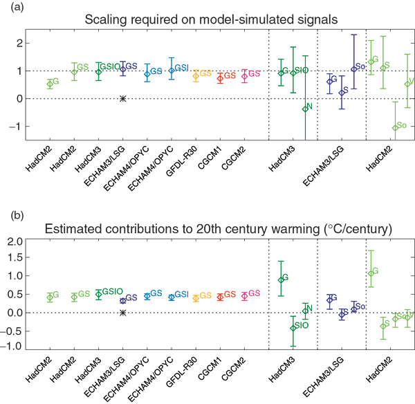 the estimates vary depending on which model's signal and what forcing is assumed,