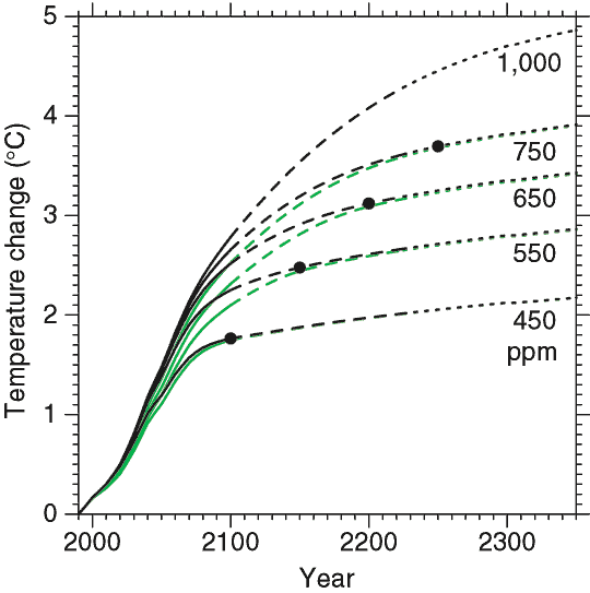 The broken lines after 2100 indicate increased uncertainty in the simple climate