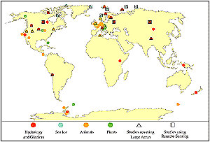 The studies mentioned above and illustrated in Figure SPM-1 were drawn from a literature survey, which identified long-term studies, typically 20 years or more, of changes in biological and physical systems that could be correlated with regional changes in temperature. 5 In most cases where changes in biological and physical systems were detected, the direction of change was that expected on the basis of known mechanisms. The probability that the observed changes in the expected direction (with no reference to magnitude) could occur by chance alone is negligible. In many parts of the world, precipitation-related impacts may be important. At present, there is a lack of systematic concurrent climatic and biophysical data of sufficient length (2 or more decades) that are considered necessary for assessment of precipitation impacts.