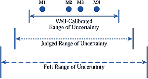 A projected range is a quantifiable range of uncertainty situated within a population of possible futures that cannot be fully identified (termed "knowable" and "unknowable" uncertainties by Morgan and Henrion, 1990). The limits of this total range of uncertainty are unknown but may be estimated subjectively (e.g., Morgan and Keith, 1995). Given the finding in the cognitive psychology literature that experts define subjective probability distributions too narrowly because of overconfidence (see Section 2.6.5.3), the inner range represents the "well-calibrated" range of uncertainty. Thus, the wider range of uncertainty represents a "judged" range of uncertainty, based on expert judgmentswhich may not encompass the full range of uncertainty given the possibility of cognitive biases such as overconfidence. Although the general point remains that there is always a much wider uncertainty range than the envelope developed by sets of existing model runs, it also is true that there is no distinct line between "knowable" and "unknowable" uncertainties; instead, it is a continuum. The actual situation depends on how well our knowledge (and lack thereof) has been integrated into assessment models. Moreover, new informationparticularly empirical data, if judged reliable and comprehensiveeventually may narrow the range of uncertainty to well inside the well-calibrated range by falsifying certain outlier values.