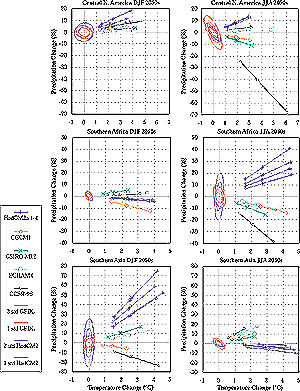 Figure 3-2: Scaled outputs of mean December-February (left) and June-August (right) temperature and precipitation change by the 2050s relative to 1961-1990 over land grid boxes representing Central North America (top), Southern Africa (middle), and Southern Asia (bottom) from eight simulations with five AOGCMs (experiments b, c, e, h, and a four-member ensemble from t; see Table 3-5). Simulations assume forcing by greenhouse gases but not aerosols, and are standardized according to the climate sensitivity of each AOGCM. Lines connect four points for each simulation, all in the same order from the origin: B1-low, B2-mid, A1-mid, A2-high. Each point represents the standardized regional changes in climate from the AOGCM, linearly scaled according to the global warming estimated with a simple climate model for one of four preliminary SRES marker emissions scenarios (B1, B2, A1, and A2) and a value of the climate sensitivity (low = 1.5°C; mid = 2.5°C, and high = 4.5°C). Also plotted are ±1 and ±2 standard deviation ellipses from the 1400-year HadCM2 and 1000-year GFDL unforced simulations, which are used to indicate natural multi-decadal variability and are orientated according to the correlation between modeled 30-year mean temperature and precipitation. Results from two other AOGCMs did not extend to the 2050s (Carter et al., 2000). |