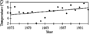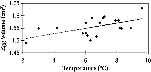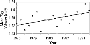 Figure 5-3: Change in egg volume of Pied Flycatcher birds over time. Regression line is y = 1.24 + 0.004 x (P<0.01). Figure 5-4: Change in the mean air temperature during the egg laying time period of the Pied Flycatcher. Regression line is y = -5.5 + 0.14 x (P<0.7). Figure 5-5: Correlation between egg volume of the Pied Flycatcher over the years and mean air temperature (regression is significant at P<0.01). |