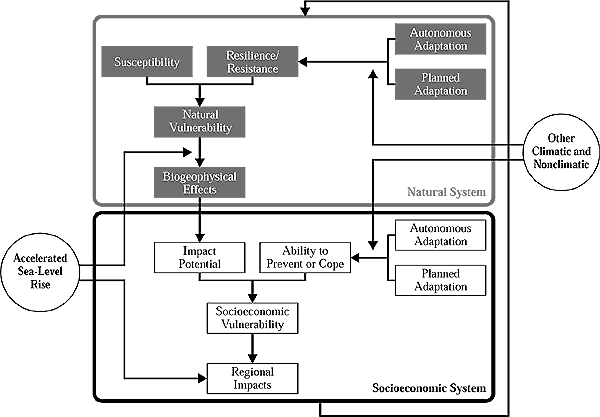 Box 6-5. Conceptual Framework for Coastal Vulnerability Assessment In the scheme illustrated below, analysis of coastal vulnerability starts with a notion of the natural system's susceptibility to the biogeophysical effects of sea-level rise and its capacity to cope with these effects (resilience and resistance). Susceptibility reflects the coastal system's potential to be affected by sea-level rise; resilience and resistance determine the system's robustness or ability to continue functioning in the face of possible disturbance. Together, these factors determine the natural vulnerability of the coastal zone.