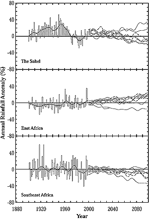 Figure 10-3: Observed annual rainfall anomalies for three African regions, 1900-1998, and model-simulated anomalies for 2000-2099. Model anomalies are for 10 model simulations derived from seven DDC GCM experiments; the four HadCM2 simulations are the dashed curves. All anomalies are expressed with respect to observed or model-simulated 1961-1990 average rainfall. Model curves are extracted directly from GCM experiments, and results are not scaled to SRES scenarios used in Chapter 3. Smooth curves result from applying a 20-year Gaussian filter (Hulme et al., 2001). |