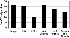 Figure 10-4 shows that the hydrological performance of Africa results in much less runoff yield than in other regions. Apart from the Zambezi/Congo Rivers, the major African rivers (Nile, Niger, Senegal, Senqu/Orange, Rufiji) traverse semi-arid to arid lands on their way to the coast. Of the world's major rivers, the Nile has the lowest specific discharge (i.e., flow per unit catchment area), even if only the part of the catchment that receives precipitation is considered (Reibsame et al., 1995). Furthermore, because these major rivers originate within the tropics, where temperatures are high, evaporative losses also are high in comparison to rivers in temperate regions. Elevated temperatures will enhance evaporative losses; unless they are compensated by increased precipitation, runoff is likely to be further reduced.