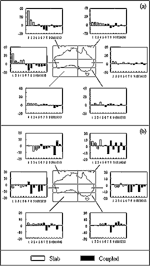 Most recent impact studies for Australia and New Zealand have been based on scenarios released by the Commonwealth Scientific and Industrial Research Organisation (CSIRO, 1996a) or the National Institute of Water and Atmosphere (NIWARenwick et al., 1998b). The CSIRO (1996a) scenarios included two sets of rainfall scenarios that are based on results from equilibrium slab-ocean general circulation model (GCM) and transient coupled ocean-atmosphere GCM (AOGCM) simulations. Some impact and adaptation studies since RICC have used results from a 140-year simulation over the whole region that uses the CSIRO regional climate model (RCM) at 125-km resolution nested in the CSIRO Mark 2 coupled GCM run in transient mode from 1961 to 2100, as well as similar simulations at 60-km resolution over eastern Australia. Figure 12-1 (from Whetton et al., 2001) summarizes results of slab-ocean and coupled AOGCM simulations of rainfall changes for various subregions of Australia in summer (December-January-February, DJF) and winter (JJA), respectively.