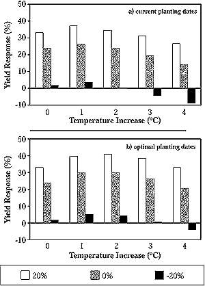 Howden et al. (1999c) report a comprehensive study of global change impacts on Australian wheat cropping. Studies were conducted of changes in wheat yields, grain quality, and gross economic margins across 10 sites in the present Australian wheat belt. Results were scaled up to provide national estimates, with and without varying planting dates. Response surfaces were constructed across the full range of uncertainty in the CSIRO (1996a) scenarios and are shown in bar-graph form in Figure 12-3. The estimated increase in yield resulting from physiological effects of a doubling of actual atmospheric CO2 is about 24%. The analysis assumes that the regional distribution of cropping is unaffected. (This is not completely accurate, but changes at the margins of present areas would not change the total yield much.) The best variety of wheat is used under each scenario, with current planting dates (a) and optimal planting dates (b) for each scenario. Note that yield reaches a maximum at about 1°C warming with current planting dates but about 2°C with optimal planting dates and that yield drops rapidly with decreases in rainfall. Under the SRES scenarios, warming in Australian wheat-growing areas would exceed 2°C and could be well in excess of 6°C by 2100; actual CO2 concentrations could be between 540 and 970 ppm.