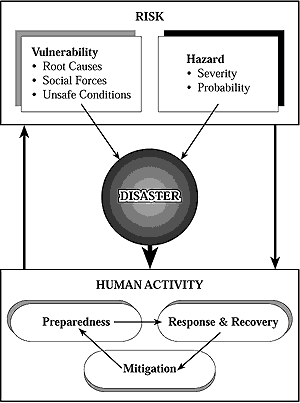 Figure 15-3: Cycle of human response to natural hazards, including response and recovery, mitigation, and preparedness. This response can alter vulnerability and thereby influence future disasters (Etkin, 1999). |