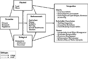 ![]() Figure 15-10: Research framework for MBIS (Cohen, 1997b). Scenarios were generated for use by physical and biological system studies. Socioeconomic component used results from these assessments, as well as climate scenario information where appropriate. Integration exercises were based on outputs from sectoral studies. |