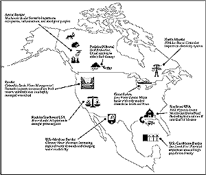 The discussion that follows offers a sample of subregional and extra-regional cases that reflect the unique and changing nature of the relationship between climate and places in the North American context. Six subregions have been defined: Pacific, Rocky Mountains-Southwest United States, Prairies-Great Plains, Great Lakes-St. Lawrence, North Atlantic, and Southeast United States (see Figure 15-9). These subregions represent unique landscapes that have experienced development paths that reflect natural potential for resource development as well as region-specific histories of evolving economies and communities. Some of these cases describe responses to recent extreme events. Others focus on scenarios of future climatic changes. Canada and the United States have a long history of cooperating on resource management concerns in transboundary areas, including the Boundary Waters Treaty of 1909 and more recent agreements on transboundary air pollution, watershed development, and the environmental agreement associated with NAFTA. There also have been binational and subregional conflicts over a wide range of issues that are climate-sensitive, including water resources, wetland protection, trading of forest and agricultural commodities, and harvesting of transboundary fish stocks. Various cooperative management approaches are being considered. Could climate change make a difference in any of these conflicts? Extra-regional issues are considered for the Arctic, U.S.-Mexican, and U.S.-Caribbean borders.