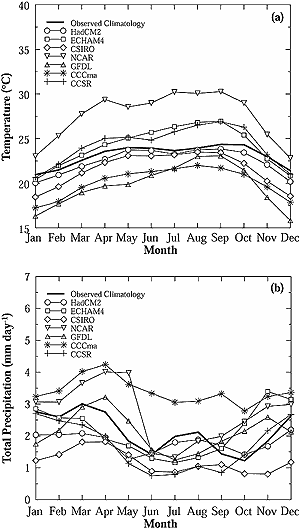For the four regions identified above, the HadCM2, ECHAM4, CSIRO, CCSR/NIES, and CCCma models have demonstrated good capability in simulating the present-day area-averaged monthly mean climatology in terms of surface temperature, diurnal temperature range, and rainfall (Lal I 2001). The model projections discussed here are the scenarios arising from GHG-induced positive radiative forcings and those that take into account the negative radiative forcing of sulfate aerosols (direct effects).
