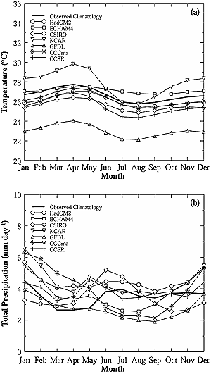 A model validation exercise was undertaken for the four main regions (the Atlantic Ocean and Caribbean Sea, the Pacific Ocean, the Indian Ocean, and the Mediterranean Sea region) in which the majority of small island states are located. The results indicate that five of the seven AOGCMs [HadCM2 (UK), ECHAM4 (Germany), CSIRO (Australia), CCSR/NIES (Japan), and CCCma (Canada)] have reasonable capability in simulating the broad features of present-day climate and its variability over these regions. Comparison of the monthly mean observed and model-simulated climatology of surface air temperature and rainfall over the Mediterranean Sea and Indian Ocean regions is shown in Figures 17-2 and 17-3. The time period of 30 years (1961-1990) in baseline climatology has been used for the purpose of these model validation exercises and to generate climate change scenarios for these island regions. Two future time periods centered around the 2050s (2040-2069) and the 2080s (2070-2099) have been considered here in developing scenarios of changes in surface air temperature and precipitation.
