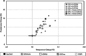 Jones et al. (1999) have produced projected ranges of change in average temperature and rainfall for the western Pacific, based on scaled patterns from three independent AOGCMs and a suite of two AOGCMs and a regional circulation model (RCM). These scaled patterns were produced by the regression method described in Hennessy et al. (1998) and Giorgi and Mearns (1999), in which the influences of decadal variability are significantly reduced. Jones et al. (1999) showed that warming in the Pacific region is projected to increase by less than the global average in most cases. Projections of rainfall are constrained by the models' ability to simulate the SPCZ and ITCZ. All models were able to produce aspects of both features, although the eastern part of the ITCZ was not well captured by any of the models; the higher resolution models were the most realistic. The models also did not produce consistent changes to these features, execept for a large increase in rainfall over the central and east-central Pacific. Most of the projected changes across the western Pacific were increases, with significant increases along the equatorial belt from North Polynesia to further east. Possible decreases were noted in some models for Melanesia and South Polynesia in both halves of the year (April-October and November-March).