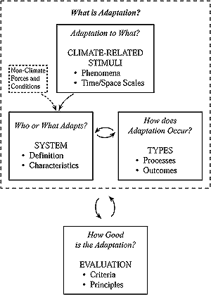 As both a process and a condition, adaptation is a relative term: It involves an alteration in something (the system of interest, activity, sector, community, or region) to something (the climate-related stress or stimulus). Description of an adaptation requires specification of who or what adapts, the stimulus for which the adaptation is undertaken, and the process and form it takes (Downing et al., 1997; Krankina et al., 1997; UNEP, 1998; Pittock et al., 1999; Risbey et al., 1999; Reilly and Schimmelpfennig, 2000). These elements are summarized in Figure 18-2 and addressed in turn in subsequent subsections.