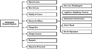 Adaptations have been distinguished according to individuals' choice options as well, including "bear losses," "share losses," "modify threats," "prevent effects," "change use," and "change location" (Burton et al., 1993; Rayner and Malone, 1998). The choice typology has been extended to include the role of community structures, institutional arrangements, and public policies (Downing et al., 1997; UNEP, 1998; see Figure 18-4).| Table 18-1: Bases for characterizing and differentiating adaptation to climate change (Smit et al., 1999). | |||