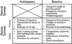 Human system adaptation can be motivated by private or public interest (i.e., who adapts?). Private decisionmakers include individuals, households, businesses, and corporations; public interests are served by governments at all levels. The roles of public and private participants are distinct but not unrelated. Figure 18-5 shows examples of types of adaptation differentiated according to timing, natural or human systems, and public or private decisionmakers.
