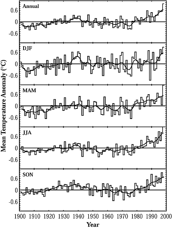 Mean surface air temperature anomalies for the African continent, 1901-1998, expressed with respect to 1961-1990 average, annual and four seasons (DJF, MAM, JJA, SON). Smooth curves result from applying a 10-year Gaussian filter.