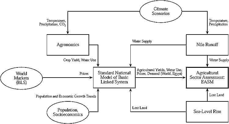 Schematic of forward-linkage approach to integrated assessment of climate change impacts on Egypt, using agricultural sector model (Yates and Strzepek, 1998).