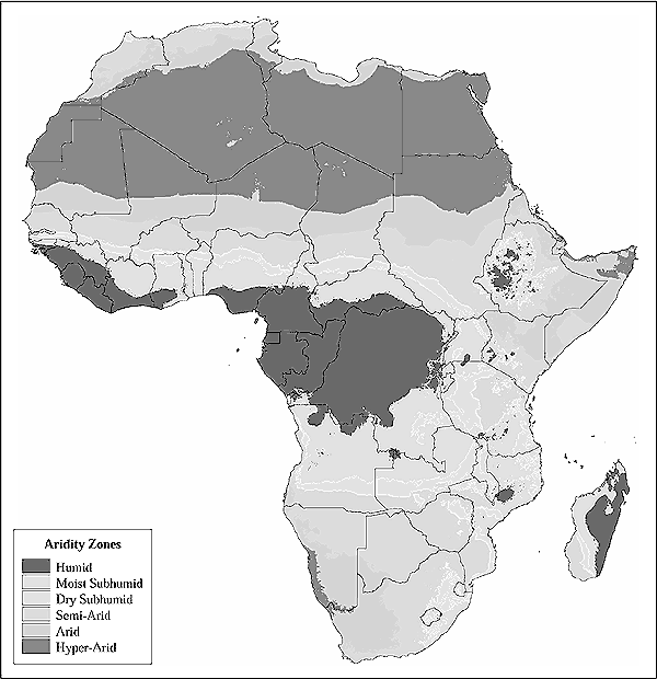 Aridity zones for Africa as derived from mean monthly precipitation and potential evapotranspiration surfaces included on Spatial Characterization Tool for Africa CD-ROM (UNDP, 1997).