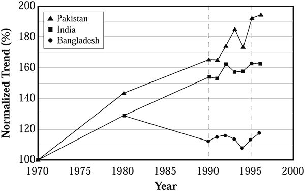 Normalized trends in grain production in Bangladesh, India, and Pakistan since 1970 (CIA, 1998).