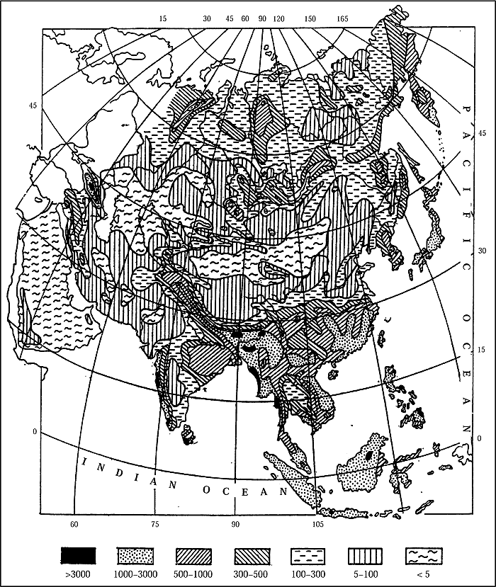 Spatial distribution of currently estimated surface runoff (mm) over Asian continent (Shiklomanov, 2001).