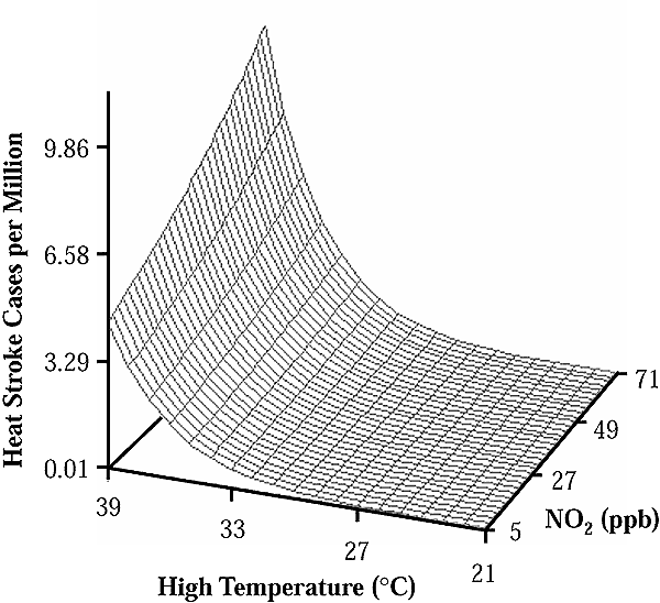 Heat stroke morbidity (cases per million; Tokyo, July-August, 1980-1995, males >65 years) (Piver et al., 1999).