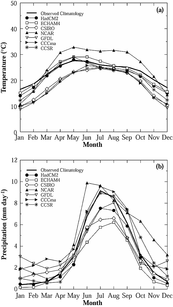 Validation of simulated and observed area-averaged annual cycles of surface air temperature (a) and precipitation (b) over south Asia.